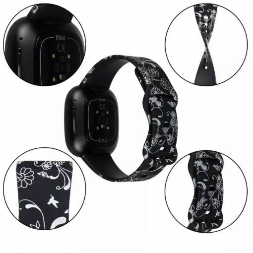 eses Curea din silicon pentru Fitbit Versa 3 și 4, Sense 1 și 2 - Mărimea L, neagră cu flori
