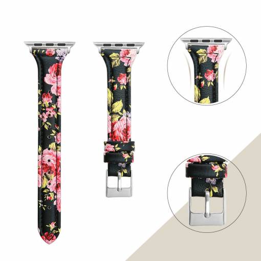 eses Kožený úzký řemínek pro Apple Watch - Květinový, černo růžový 42mm, 44mm, 45mm, 49mm